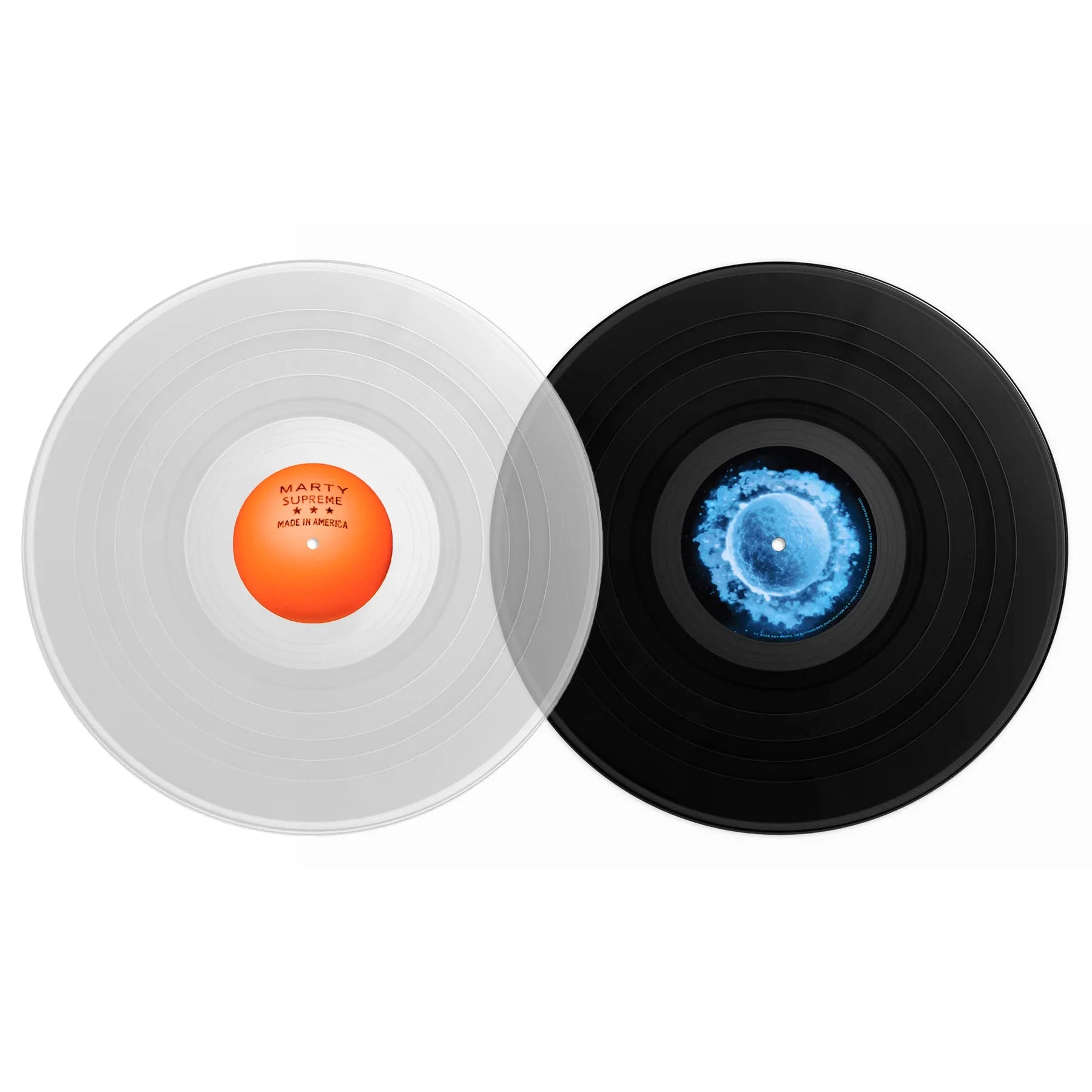 Banda sonora original de Daniel Lopatin (Oneohtrix Point Never) para Marty Supreme, prensado en vinilo negro y transparente. Incluye una tira obi japonesa y un póster oficial de doble cara de Koto Endo y la bola oficial de Marty Supreme.